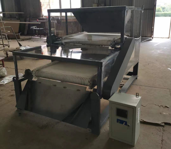 强辊干式磁选机是我公司经多年市场经验独立研发的一种新型干选设备,可根据需求生产1-10层结构,实现物料的多次分选。该机对粉矿率较少但又均匀的中小颗粒状矿石分选效果卓越,生产效率高,操作简单方便。特别是对锰矿、赤铁矿、假像赤铁矿、镜铁矿、菱铁矿、锰矿、铬铁矿针铁矿、褐铁矿、菱铁矿、铬铁矿、铌钽铁矿、钛铈铁矿、黑钨矿、铁英岩矿、磷灰石、磷钇矿、橄榄石、硫铜锗矿、铁白石、黑云母、绿帘石、蛇纹石、原生钛铁矿,海滨砂矿,原生金红石,黑钨矿和大部分造岩矿物—石英﹑长石﹑方解石、黑云母,角闪石,橄榄石,电气石,辉石等的干式磁选有显著效果。其运行原理是物料经料仓落入匀速给料装置,通过给料装置将物料在没有进入磁选区之前,用振动的方式对物料和磁性物质通过重力和振动,使粘连或包裹的磁性物质基本实现分散状态。并能够均匀的送到磁选区域,在设备的磁选区受到重力和磁场力的作用下,利用物料的磁性差异有不同的运动轨迹实现分离,磁性矿物被吸附在磁辊表面旋转到达精矿区,毛刷将吸附在磁辊表面上的磁性矿刷脱。